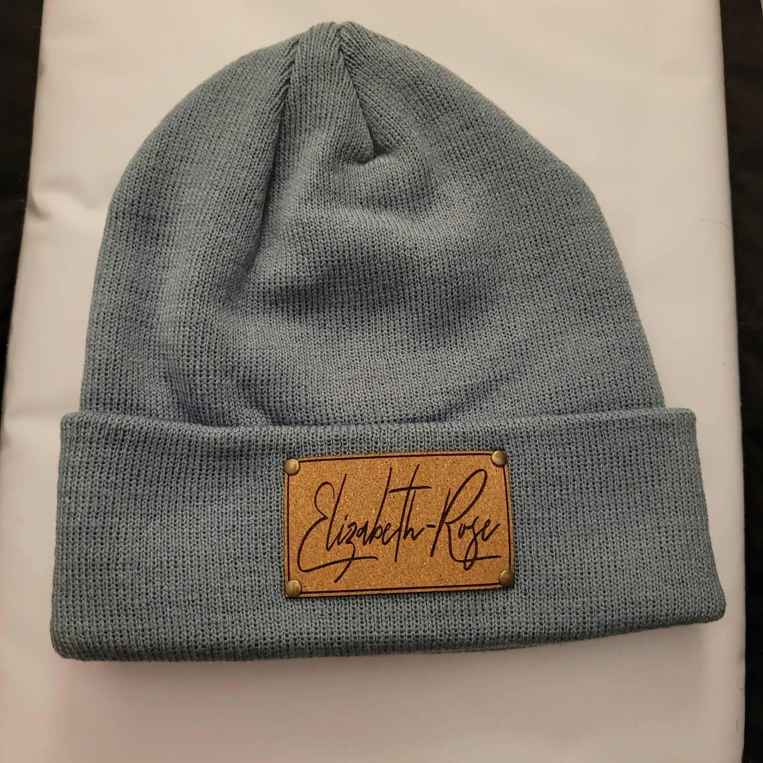 Our super soft and stretchy 100% acrylic beanies are customized to order with high quality vegan leather patches secured with stylish solid brass rivets in your choice of matte black, aged brass or brushed nickel. Poms are made of high quality faux fur attached to a safety pin for application.